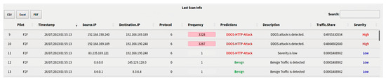 The PMEM has detected the IP addresses which are trying to perform a DDOS attack, also including the frequency of the specific combination of source IP and destination IP. The severity of the attack is related to its computed frequency. The system shows, for instance, that the 3rd row in the table is considered a DDoS attack with low severity because the frequency is only 1, whereas the two first rows are considered real DDoS attacks because the frequencies are higher than a specific threshold.