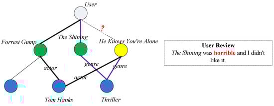 Example of the need to focus on aspects that the user dislikes. The previous approach, which propagated user interests based on their interaction history (green nodes), was likely to recommend yellow node movies (thriller genre). However, it was learnt from user comments that the user disliked thriller movies.