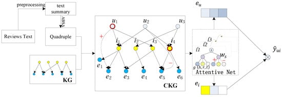 In addition to this, these methods have the following problems: existing methods extract aspect items and sentiment information from reviews, but they cannot effectively correlate this information during coding, resulting in the inability to fully utilize extracted features. On the other hand, the existing methods only focus on the aspects that users like, while ignoring the aspects that users dislike, and they cannot completely model users’ real preferences. We believe that by effectively integrating the information extracted from reviews with knowledge graphs, the important information extracted from review texts can be more fully utilized, and the recommendation performance can be effectively improved. At the same time, focusing on user disliked aspects based on the aspect sentiment information extracted from reviews can more accurately model user preferences, thus improving the accuracy of recommendations.