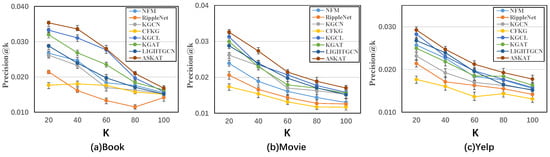 Experimental results of precision@k metrics for three datasets in the Top-k recommendation scenario. The figure shows the experimental results (precision@k metrics) of our ASKAT model and other comparative models on the three datasets of Book, Movie, and Yelp, respectively, with the inclusion of error bars at each point. The horizontal coordinate indicates the value of K and the vertical coordinate indicates the corresponding precision value.