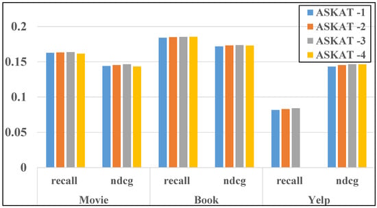 Effect of the number of embedded propagation layers. In Table 4, we analyse the effect of different number of layers on ASKAT. From the table, we can observe that the performance of the model basically showed an upward trend with an increase in the number of layers of embedding propagation, i.e., the more layers, the better the model. However, when the number of layers increased to a certain degree, the performance of the model began to show a decreasing trend. This indicates that when the number of layers increased, the utility of the higher-order features in the knowledge graph was compared with the introduced noise, and, obviously, the noise prevailed. According to the experimental results, the performance of the model was best when the number of layers was 3. In order to better present the results, we also visualised the results of this experiment, as shown in Figure 4.