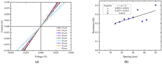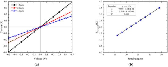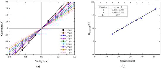 (a) Simulated I-V characteristics for several c-TLM spacings fabricated on a 2 µm thick substrate with the specific contact resistance equal to 1 × 10−5 Ω·cm2. (b) Evolution of the resistance as a function of the c-TLM spacing.