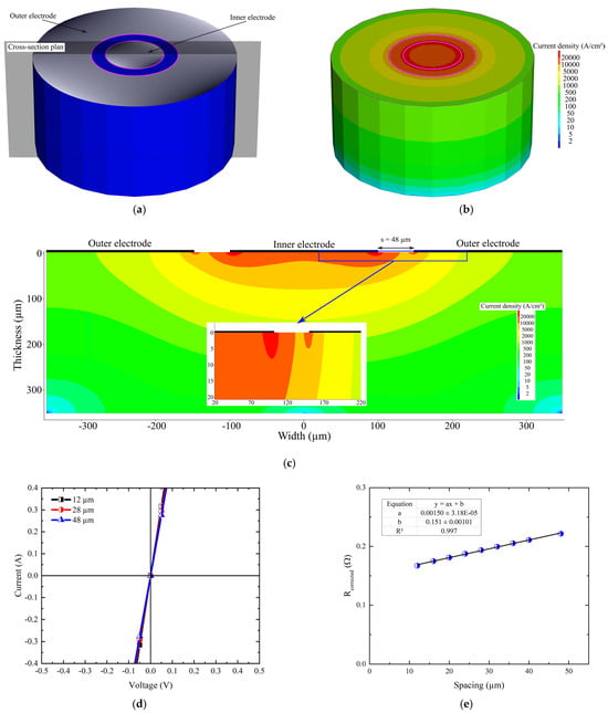 (a) A 3D view of the simulated structure; the specific contact resistance at the electrode/4H-SiC interface is fixed at 1 × 10−5 Ω·cm2. Current density circulating into a c-TLM structure deposited directly onto the substrate under a difference of potential of 1 V in (b) 3D view and (c) cross-sectional view. In (c), an inset picture is presented, highlighting the current density between the electrodes. (d) Simulated I-V characteristics for several c-TLM spacings. (e) Evolution of the resistance as a function of the c-TLM spacing.
