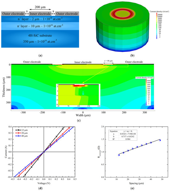 (a) Diagram of the structure with the isolation layer (10 µm/1 × 1016 at·cm−3); the specific contact resistance at the electrode/4H-SiC interface is fixed at 1 × 10−5 Ω·cm2. Simulated current density circulating in a c-TLM structure (s = 48 µm) under a difference of potential of 1 V in (b) 3D view and (c) cross-sectional view. In (c), an inset picture is presented, highlighting the current density between the electrodes. (d) Simulated I-V characteristics for several spacings of the c-TLM with their associated resistance. (e) Evolution of the resistance of a function of the spacing.