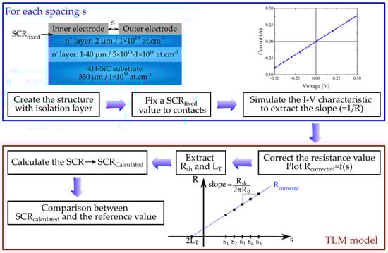 The method used to estimate the influence of the isolation is described in Figure 7. The approach began with the definition of the c-TLM structure. On the 4H-SiC substrate (350 µm/1 × 1018 at·cm−3) was deposited the n− isolation layer, with variable characteristics in terms of thickness (1–40 µm) and doping level (5 × 1013–1 × 1016 at·cm−3). Then, the n+ layer, presenting a doping level equivalent to the SiC substrates (1 × 1018 at·cm−3), was grown onto the n− layer. The influence of its thickness is investigated in Section 5.1. To complete the structure definition, the inner and the outer electrodes, distant by a spacing s, were placed at the top of the n+ layer. To optimize the calculation resources, only half of the cross-section was design and meshed. The contact electrical performances were defined by their specific contact resistance (SCRfixed) ranging from 1 × 10−3 Ω·cm2 to 1 × 10−6 Ω·cm2. Then, the current circulation was calculated for the rebuilt 3D structure by a cylindrical symmetry along the thickness axis, for voltage ranging from −1 V to 1 V to simulate the I-V curve. The described approach was repeated for each spacing from 12 to 48 µm. As a result, nine I-V characteristics were simulated as performed experimentally.