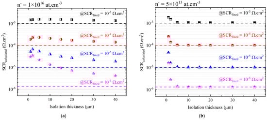 Afterwards, as seen in Figure 8a, for an isolation doping level of 1 × 1016 at·cm−3, the error on the SCR determination (illustrated by the gap between the symbol and the dashed line) seems quite acceptable for the largest thicknesses and for SCRfixed ≥ 10−4 Ω·cm2. But, the miscalculation strongly increases for good ohmic contacts presenting a lower SCRfixed. For instance, at SCRfixed = 10−6 Ω·cm2, the overestimation factor is 5.5 for the 20 µm thick isolation layer, which means that the SCR value that could be determined experimentally would be 5.5 × 10−6 Ω·cm2 whenever the intrinsic SCR level might be 1 × 10−6 Ω·cm2. Therefore, this isolation doping level seems compatible for measuring low performing contacts reporting SCR up to 10−4 Ω·cm2.
