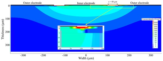 Cross-section of the current density in the c-TLM structure (s = 48 µm) when the isolation layer is 5 µm thick and doped at 5 × 1013 at·cm−3. The specific contact resistance at the electrode/4H-SiC interface is fixed at 1 × 10−5 Ω·cm2. An inset picture is presented, highlighting the current density between the electrodes.