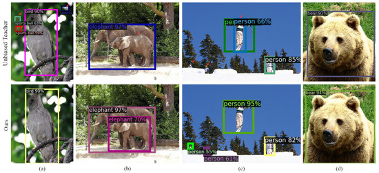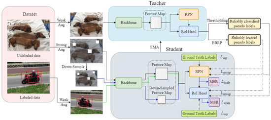 - A novel bounding box re-prediction (BBRP) strategy is presented to re-predict the object’s bounding box, obtaining reliably located pseudo-labels of unlabeled data and thus improving the localization capability of the student model.