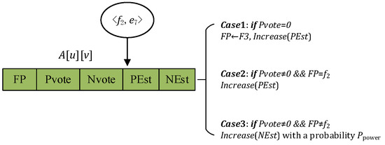 In the estimator-sharing method, multiple flows are hashed into the same estimator because the number of estimators is far less than the number of flows. Intuitively, we can adopt the majority vote algorithm (MJRTY) [23] to search the candidate super spread. MJRTY maintains a vote key and a vote counter in one bucket. When processing an element , if is equal to the vote key, then the estimator is increased or decreased. By comparing with the vote key, the estimator can accurately find the element that repeatedly occurs for more than half of the elements of the input. In today’s network environment, online processing has become an important performance requirement. To provide an online spread estimation of a super spread, we use two estimators in one bucket: a pvote estimator and an nvote estimator. The pvote estimator counts and records the number of distinct elements of the candidate flow, and the nvote estimator counts and records the number of distinct elements of the other flows.