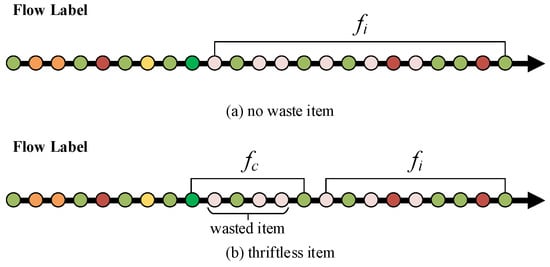 Case 2: We divided the real value of the super spread into two parts and , where represents the wasted items before becomes the candidate flow, and represents the items after becomes the candidate flow. When becomes the candidate flow, the analysis is the same as in case 1. For the same reason, the number of all items is divided into two parts: and . Then, we have:
