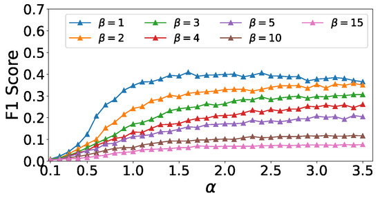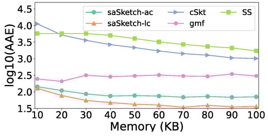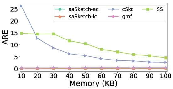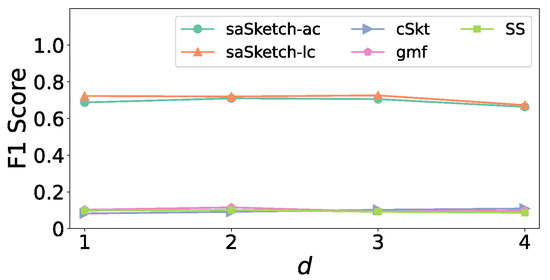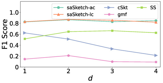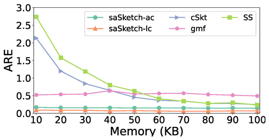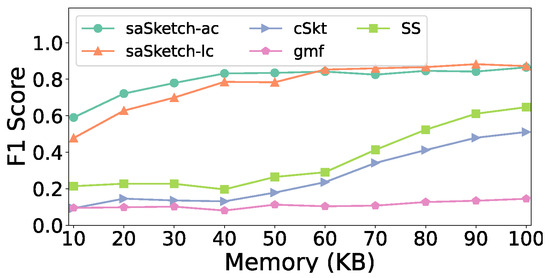 Figure 10 shows the impact of memory on the F1 score. The F1 score of all algorithms increases as memory increases. The F1 scores of saSketch-lc and saSketch-ac are both higher than those of other algorithms with different memories. The F1 score of saSketch-ac, saSketch-lc, cSkt, SS, and gmf is 0.60, 0.63, 0.10, 0.09, and 0.09, respectively, when memory is 50 KB.