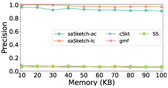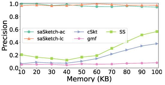 Figure 11, Figure 12 and Figure 13 show the accuracy of super spread detection in the CAIDA dataset. The results in the CAIDA dataset are similar to that of the e-commerce dataset except for recall. A small difference in the recall is that cSkt surpasses saSketch-lc and saSketch-ac at 70 KB (Figure 12) and is approximately the same when the memory is larger. The F1 scores of saSketch-lc and saSketch-ac are both higher than those of other algorithms with different memories. The F1 score of saSketch-ac, saSketch-lc, cSkt, SS, and gmf is 0.83, 0.78, 0.18, 0.26, and 0.11, respectively, when the memory is set to 50 KB.