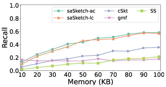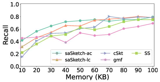 Figure 9 shows the effect of memory on recall. The recall of all algorithms increases as the memory increases. The recall of saSketch-lc and saSketch-ac are both higher than those of the other algorithms when memory is set to larger than 20 KB. When memory is set to 50 KB, the recall of saSketch-ac, saSketch-lc, cSkt, SS, and gmf is 0.44, 0.46, 0.22, 0.12, and 0.15, respectively.