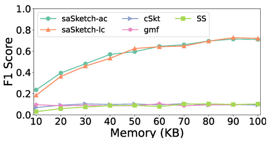 In conclusion, the F1 scores of saSketch-lc and saSketch-ac are higher than those of the other algorithms with different memories.