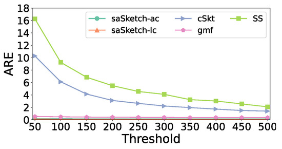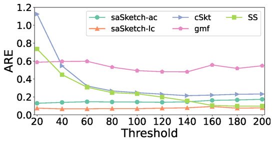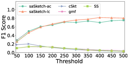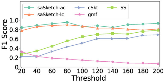 Figure 14 shows the effect of the threshold on the F1 score for the e-commerce dataset. The F1 score of saSketch-lc and saSketch-ac increase as the threshold increases while those of the other algorithms decrease. Figure 15 shows the impact of threshold on the F1 score in the CAIDA dataset. The F1 score of saSketch-lc and saSketch-ac have little change as threshold increases. In conclusion, the F1 score of saSketch-lc and saSketch-ac are both higher than those of the other algorithms with different thresholds.