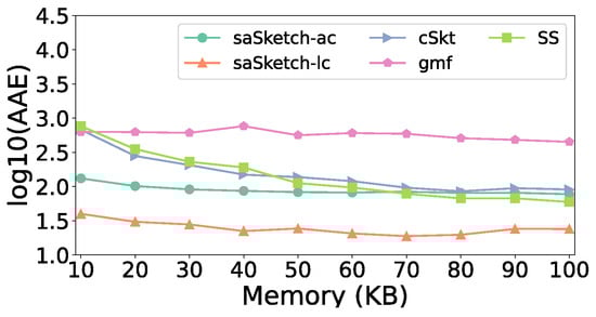 When memory is 50 KB, the AAE of saSketch-ac, saSketch-lc, cSkt, SS, and gmf is 77, 42, 2163, 4052, and 302 respectively. The ARE of saSketch-ac, saSketch-lc, cSkt, SS, and gmf is 0.15, 0.08, 5.5, 10.5, and 0.41, respectively.