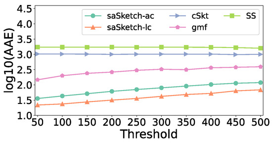 Figure 20 and Figure 21 show the error of the estimated cardinality of the super spread in the e-commerce dataset. When the threshold increases, the AAEs of most algorithms increase slightly. When the threshold is 250, the AAE of saSketch-ac, saSketch-lc, cSkt, SS, and gmf is 71, 36, 1012, 1714, and 300 respectively. The ARE of saSketch-ac, saSketch-lc, cSkt, SS, and gmf is 0.15, 0.07, 2.65, 10.5, and 0.41, respectively.
