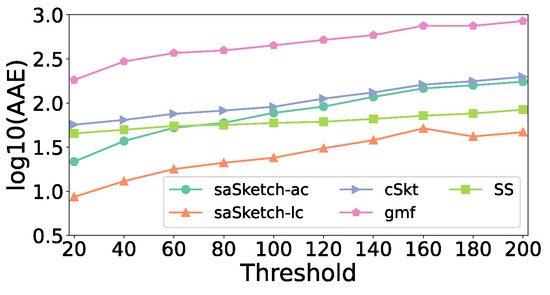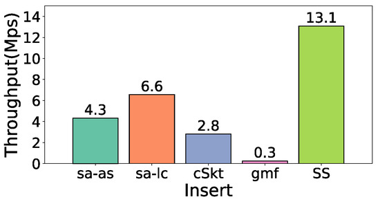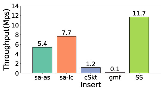 Figure 24 and Figure 25 show the insert throughput of adding a flow-element pair of a data stream to a sketch. gmf has the lowest insert throughput because it requires non-negligible time to traverse the flow store structure. SS has the highest throughput as it calculates the length of the longest 0 bit through the hash of the key to update the count value of the bucket, and cSkt, saSketch-ac, and saSketch-lc need to calculate the cardinality estimator after inserting the incoming item into this estimator. saSketch-ac and saSketch-lc are faster than cSkt because the bucket of cSkt has only one cardinality estimator, and each item needs to be inserted into the cardinality estimator to calculate the corresponding value, whereas saSketch-ac and saSketch-lc have two cardinality estimators PEst and NEst per bucket. If the flow label of the incoming item is differentiated from the key of the corresponding bucket, there is a high probability that insertion into the NEst cardinality estimator does not need to be performed. The probability depends on the current pvote value, and the larger the pvote, the higher the probability of ignoring.