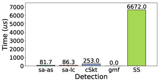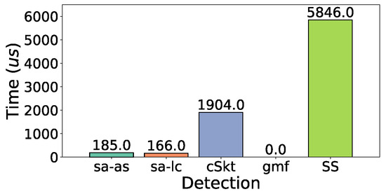 Figure 26 and Figure 27 show the detection time of returning all reported super spreads in the e-commerce dataset and CAIDA dataset, respectively. The detection of gmf is 0 because gmf has a structure to store super spreads all the time. SS has the highest detection time because it needs to calculate the spread for traversing each bucket. saSketch-lc and saSketch-ac both return super spreads in a few microseconds.