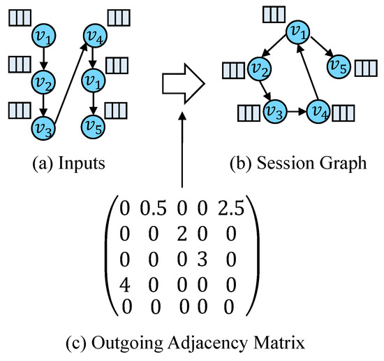 Given the limited consideration of the impact of time on session graph modeling in previous research, we reconsider this aspect in session graph construction. A session is a directed sequence, consisting of various items (nodes) and directed edges between items. The order of directed edges represents the time sequence in which these nodes are visited. The strategy utilized by SR-GNN [23] was followed, which involves transforming a session into a directed session graph. If a node is visited multiple times, we do not create new vertices for each visit. Instead, we directly connect the node, which has been visited multiple times, to its subsequent node (or the preceding node). If a node in the graph is visited multiple times, we do not create new vertices for each visit. Instead, we directly connect the node, which has been visited multiple times, to its subsequent node (or the preceding node). There are two adjacency matrices in a directed session graph: one for an incoming adjacency matrix and one for an outgoing adjacency matrix [23]. Suppose we have an edge with nodes and , where starts the edge and ends it. The weight of each edge can be defined as: