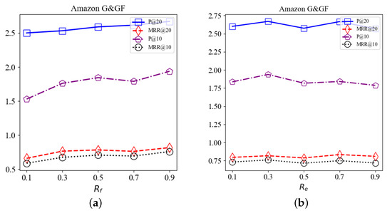 Parameter analysis of and on Amazon G&GF dataset. (a) The influence of on Amazon G&GF dataset. (b) The influence of on Amazon G&GF dataset.