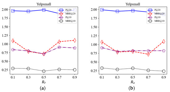 Parameter analysis of and on Yelpsmall dataset. (a) Influence of the parameter . (b) Influence of the parameter .