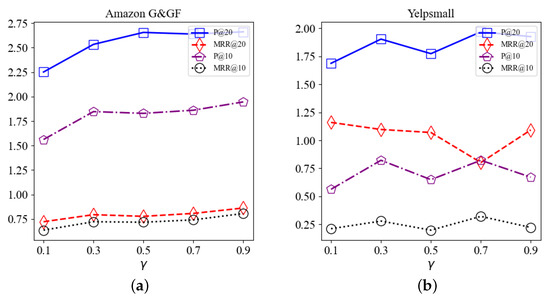 Parameter sensitivity analysis on . (a) on Amazon G&GF dataset. (b) on Yelpsmall dataset.