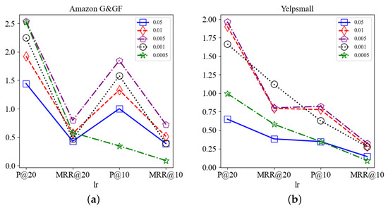 Parameter sensitivity analysis on learning rate. (a) Learning rate on Amazon G&GF dataset. (b) Learning rate on Yelpsmall dataset.