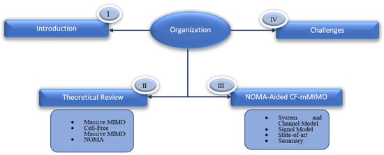 For readability, Table 1 defines the acronyms used throughout this paper. Figure 1 describes the organization of work within the paper. In Section 2, the paper provides a brief introduction to the fundamentals of massive MIMO (mMIMO), CF-mMIMO, and NOMA. In Section 3, we present a focused literature review of NOMA with CF-mMIMO. We present a simple NOMA-aided CF-mMIMO system model that considers single-antenna APs and single-antenna user equipment (UE) with a time-division duplex (TDD) transmission protocol. We further analyze the various works that concern NOMA with CF-mMIMO, to highlight the challenges and objectives of different studies. Section 4 summarizes the challenges of NOMA with CF-mMIMO and its potential integration with other enabling technologies in the current area of research. Finally, Section 5 concludes the paper and discusses key findings and possible future research directions.