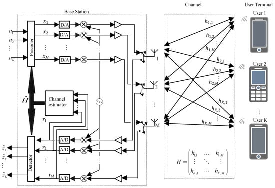 In Figure 2 and Figure 3, the sequences relayed to the K users are represented as , provided corresponds to the symbols directed to the kth user. Following precoding, the resulting transmitted signals are represented as , where represents the relayed signal by the mth antenna. In downlink transmission, the signals acquired by the users are generally represented as , where denotes the signal received by kth user. The H matrix dimensions describe the channel. The received signal could then be represented as follows: