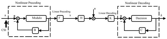 Figure 3 illustrates the general structure of communication systems incorporating precoding and decoding techniques. F is the feedforward matrix of linear precoding, B represents a feedback matrix of linear precoding, represents the feedforward matrix of non-linear decoding, and C represents the feedback matrix of non-linear precoding. These matrices define the precoding techniques employed, which may be linear, non-linear, or hybrid.