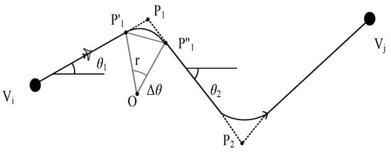 From a typical horizontal flight path, it can be known that aircraft usually follow a straight line from one waypoint to another or near that point, turn and take a new course, and fly in a straight line again. Horizontal flight routes are all composed of linear flight segments and arc flight segments. The aircraft speed and direction remain unchanged in the linear flight segment, while inscribed turn is most commonly used in the arc flight segment (as shown in Figure 2). Vi and Vj in the figure are take-off and landing cities, P1 and P2 are waypoints, route segment ViP1 is the straight flight segment, and the route segment is the arc flight segment. The flight path of the straight section can be described as: