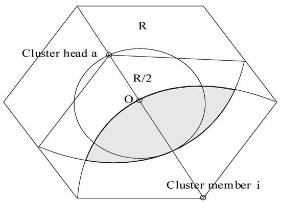 It is easy to know from Equation (10) that when n = 6, the repeated coverage area is the smallest. Therefore, a circle with a communication radius of R can obtain loophole-free coverage with minimal repetitive coverage and the most ideal cluster structure by making communication coverage for the area with its inner regular hexagon. □