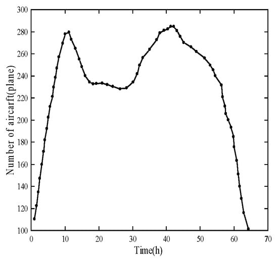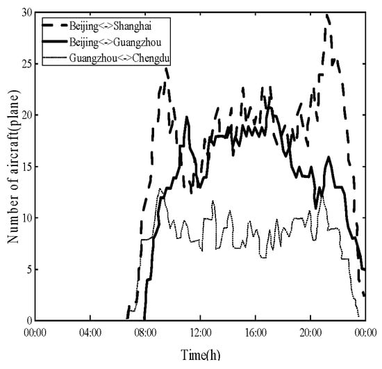 It can be seen from Figure 9 and Figure 10, during 00:00 to 6:00, the number of flights on China’s main routes is small, while during 8:00 to 24:00, the number of planes on the routes is large, and the density of planes in the air is large and stable, which meets the conditions for the formation of aviation ad hoc network. Therefore, when comparing and verifying the clustering performance, the simulation is mainly carried out between 8:00 and 24:00. In this paper, the actual data such as the above-mentioned routes and flight distribution are used as the conditions and parameters of the clustering performance simulation experiment, and the experimental environment is built accordingly.