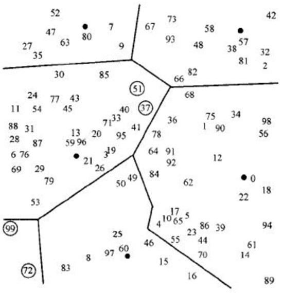 Figure 11, Figure 12 and Figure 13, respectively, show the clustering structures formed by the Lowest-ID algorithm, Max-Degree algorithm and the proposed method. Among them, the solid black dot represents the cluster head. It can be seen from the figures that in both Lowest-ID and Max-Degree algorithms, there are clusters composed of one or two nodes and the number of formed clusters is large, and the number of nodes in the clusters is not uniform.