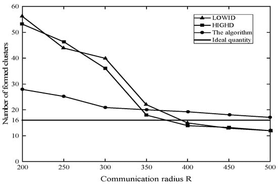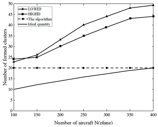 Since it is in a cluster of planar structure, for inter-cluster communication carried out through the gateway, the smaller the number of cluster heads, the smaller the number of hops between nodes and the better the performance of the network. It can be seen from Figure 14 that the number of clusters formed by this algorithm is the lowest and remains unchanged. This is because when the number of clusters is counted from the perspective of the whole network, the algorithm takes the geographical cluster as the unit, which has a large coverage area, so the number of formed clusters is minimum. In the other two algorithms, the number of formed clusters is affected by the number and density of aircraft in the network, so the volatility is high. In addition, combined with the cluster structure, it is easy to know that the number of clusters between any two aircraft in the whole network is no more than five, which effectively improves the route forwarding efficiency.