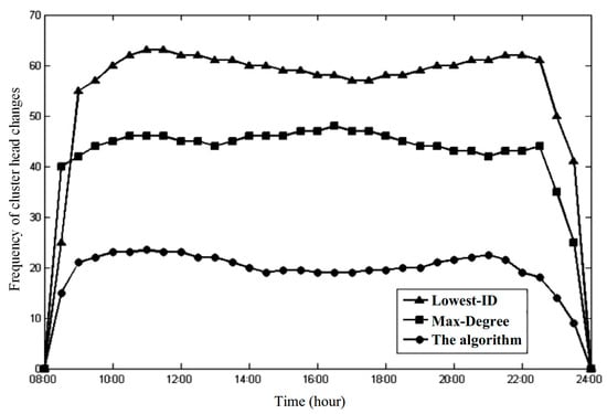 The change frequency of cluster heads is the number of cluster head changes per unit of time. The less the cluster node changes, the more stable the cluster structure is. The experiment was selected between 8:00 and 24:00, with 30 min as the unit time; the communication radius was 300 km and the experimental results of the cluster head change frequency are shown in Figure 16.