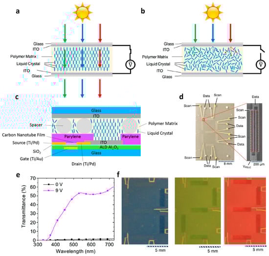 A liquid crystal display (LCD) is one of the types of displays and is currently used in most televisions and monitors. The working principle is to control the amount of light transmitted by controlling the arrangement of liquid crystals located between two polarizers through voltage. To express color, color filters corresponding to red, green, and blue are used. Additionally, there are LCDs that are driven by using a reflector instead of a backlight to reflect external light. Cong et al. demonstrated an active-matrix polymer-dispersed liquid crystal (PDLC) seven-segment display using CNT TFT []. They utilized PDLC, formed by embedding micro-sized liquid crystals into a polymer matrix, and controlled the transparent or opaque state based on the refractive index difference between the polymer matrix and the liquid crystal, depending on the applied voltage (Figure 1a,b). The proposed PDLC display has a structure in which two ITO electrodes are sandwiched above and below the liquid crystal (Figure 1c). Figure 1d illustrates a CNT TFT-based backplane for driving a seven-segment display. The fabricated PDLC display demonstrated the ability to clearly distinguish light transmittance in the visible light region based on the voltage applied to both ends of the PDLC. Building on this capability, they successfully displayed numerical information by selectively controlling the liquid crystal of each pixel through CNT TFT.