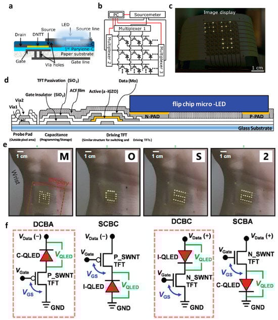 Baek et al. implemented a CNT TFT-based active-matrix QLED display []. In particular, to investigate the optimum design for a high-performance QLED array, they compared the characteristics of a total of four types of QLED arrays according to the type of driving TFT (p- or n-type) and the connection configuration between QLED and the driving transistor (conventional QLED or inverted QLED) (Figure 2f). They passivated Si3N4 on p-type CNT TFT to prepare n-type CNT TFT. The conversion of CNT TFT to n-type operation through Si3N4 passivation is because the positive fixed charge in Si3N4 causes n-type doping and protects it from atmospheric oxygen and water, which cause p-type doping effects [,]. Subsequently, the distinction between conventional QLED and inverted QLED was defined based on whether the upper Al and lower ITO electrodes served as cathode/anode or anode/cathode, respectively. At this point, depending on whether ITO, the bottom electrode of QLED, is in contact with the drain or source of the driving transistor, the cases were classified into four structures: (i) drain contact with the bottom anode (DCBA), (ii) source contact with the bottom cathode (SCBC), (iii) drain contact with the bottom cathode (DCBC), and (iv) source contact with the bottom anode (SCBA). As a result of comparing the electrical and optical characteristics of the four structures, when the QLED was connected to the source of the driving TFT (SCBC, SCBA), it showed poorer performance than when connected to the drain. This is because the voltage between the gate and source, which determines the drain current, is reduced due to the voltage drop occurring at the QLED. Therefore, when applying a p-type or n-type TFT as a driving TFT, it is advantageous to adopt the DCBA and DCBC structures. Based on this, they ultimately produced a 5 × 5 QLED array with p-type and n-type CNT TFTs as driving TFTs and demonstrated real-time display of character images.