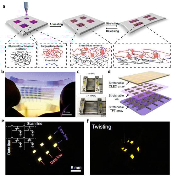 Liu et al. utilized the advantages of LEC to implement an organic-based stretchable active-matrix organic LEC (OLEC) array []. They first fabricated a stretchable active-matrix TFT array to drive a stretchable OLEC array. They mixed a crosslinker containing flexible polydimethysiloxane into conjugated polymers to prevent the semiconductor layer from delamination from the perfluorinated elastomer used as the gate dielectric when the TFT is stretched (Figure 3a). At this time, the introduced crosslinker strengthened the bond between the two layers by crosslinking the conjugated polymers and the elastomeric dielectric layer during the annealing process, thereby preventing delamination of the semiconductor layer when stretching. Based on this, they successfully fabricated a stretchable TFT array (Figure 3b,c). Then, OLEC was integrated on the TFT array (Figure 3d), and it was demonstrated that OLEC could be driven through OTFT both without twisting and with twisting (Figure 3e,f).