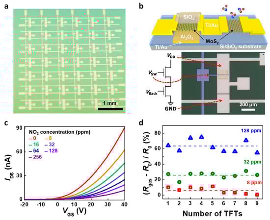 Gas sensors are widely applied as devices that detect the presence of target gas in a specific space. In particular, measuring oxygen concentration or detecting harmful gases can inform people in the area of danger early and help them evacuate. Therefore, it is important for gas sensors to detect even minute levels of concentration quickly. Kim et al. demonstrated NO2 gas detection using a two-step grown MoS2 TFT-based gas sensor array (Figure 5a) []. Here, the two-step growing method proceeds with a sputtering step followed by a thermal sulfurization step. For both the switching TFT and the sensing TFT, two-step grown MoS2 was applied as a channel, but the switching TFT was passivated with a SiO2 layer to prevent reaction with gas (Figure 5b). In the case of the sensing TFT, the drain current decreased as the concentration of NO2 gas increased (Figure 5c). This means that NO2 gas increases the resistance of the MoS2 channel, and when the concentration of each NO2 gas was 128 ppm, the resistance increased by about 60% compared to the initial resistance (Figure 5d). The reason why MoS2 TFT was able to react to NO2 is because two-step grown MoS2 has a poly-crystalline structure and many grain boundaries. In fact, for this reason, defects are intentionally formed to improve reactivity to gas.