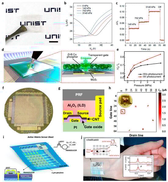Jang et al. replaced graphene with MoS2, a well-known 2D semiconductor, as the channel layer to address the high-off-current issue, a drawback in existing graphene FET-based pressure sensors []. Although MoS2 has a two-dimensional structure, it differs from graphene in having a band gap suitable for a semiconductor channel. Notably, MoS2 exhibits the ability to control electrical and optical properties depending on the number of layers. In the case of monolayer MoS2, it possesses a direct band gap and outstanding optical properties. By incorporating monolayer MoS2, which exhibits both excellent electrical and optical properties, into the pressure sensor, they successfully developed a pressure sensor array with low power consumption. Moreover, they leveraged the optical properties of monolayer MoS2 to enhance pressure sensitivity further by introducing mechanoluminescent materials that emit visible light when compression or friction force is applied (Figure 6d). Through this approach, when pressure is applied to the MoS2-based pressure sensor, not only does the dielectric thickness decrease, but the additional effect of excess carriers being created in MoS2 by the emission of mechanoluminescent materials is introduced. This results in an increased amount of change in current for the same pressure (Figure 6e).