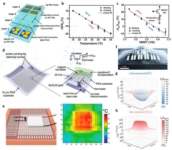 - Ren, X.; Pei, K.; Peng, B.; Zhang, Z.; Wang, Z.; Wang, X.; Chan, P.K. A low-operating-power and flexible active-matrix organic-transistor temperature-sensor array. Adv. Mater. 2016, 28, 4832–4838. [Google Scholar] [CrossRef] [PubMed]