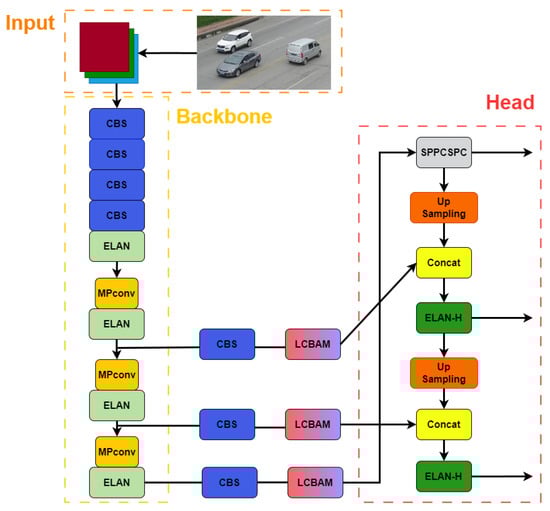 In the detection end of our multi-object tracking method, the LCBAM attention mechanism is added to the YOLOv7 network structure, as shown in Figure 5.