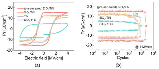 The dependence of the electric field and remanent polarization of HZO capacitors on different structural configuration is shown in Figure 2a. Notably, the W/HZO/(pre-annealed) ZrO2/TiN/p+ Si capacitor exhibits the largest remanent polarization (2Pr of 32 µC/cm2), highlighting the advantageous role of the ZrO2 interfacial layer in ferroelectric devices. Interestingly, the capacitor with a 2 nm SiO2 layer on the TiN bottom electrode demonstrates a similar Pr compared with W/HZO/TiN/p+ Si under the same electric field. Furthermore, the hysteresis curve of the W/HZO/SiO2/p+ Si capacitor presents the lowest, as well as an asymmetric, loop, which is due to electrode asymmetry. The top and bottom electrode materials (W and p+ Si) have different work functions, which leads to different barrier heights at the interfaces, resulting in different leakage currents under positive and negative bias. It is worth mentioning that all P-E curves were obtained from devices in their pristine state.