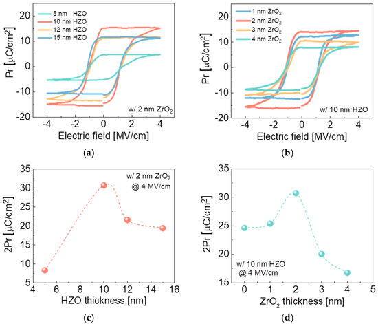 (a) Pr of W/HZO/(pre-annealed) ZrO2/TiN/p+ Si capacitors dependent on different HZO thicknesses with a fixed pre-annealed 2 nm ZrO2 interlayer. (b) Pr of W/HZO/(pre-annealed) ZrO2/TiN/p+ Si capacitors depends on different ZrO2 thicknesses with a fixed 10 nm HZO ferroelectric layer. (c) 2Pr value vs. HZO thickness originating from (a). (d) 2Pr value vs. ZrO2 thickness achieved from (b).