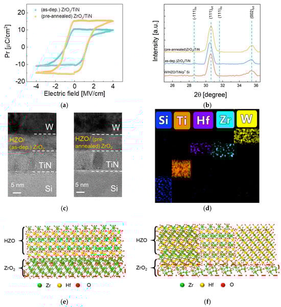 (a) Pr value comparison of W/HZO/(pre-annealed) ZrO2/TiN/p+ Si capacitor vs. W/HZO/(as-deposited, abbreviated to as-dep. in the figure) ZrO2/TiN/p+ Si capacitor. (b) GIXRD patterns of W/HZO/TiN/p+ Si, W/HZO/(as-deposited) ZrO2/TiN/p+ Si and W/HZO/(pre-annealed) ZrO2/TiN/p+ Si capacitors. (c) Cross-sectional TEM images of W/HZO/(as-deposited) ZrO2/TiN/p+ Si and W/HZO/(pre-annealed) ZrO2/TiN/p+ Si structures. (d) EDS elemental mapping results of W/HZO/(pre-annealed) ZrO2/TiN/p+ Si structures with the distribution of Si, Ti, Hf, Zr, and W. (e) Schematic of the pre-annealed ZrO2 layer (Zr atoms green) and the following HZO layer (Hf atoms represented in yellow). (f) Schematic of the as-deposited ZrO2 layer (Zr atoms represented in green) and the following HZO layer (Hf atoms represented in yellow).