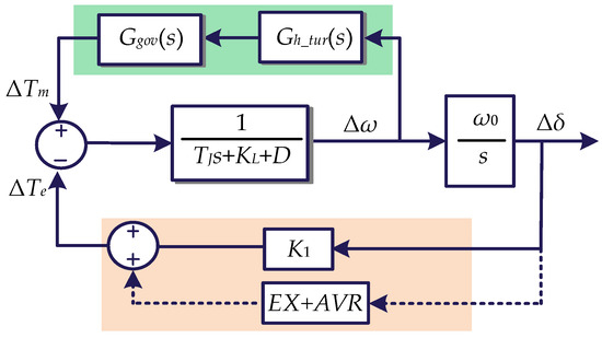 The basic Philips–Heffron model of a hydropower generator is given in Figure 1. There are two parts to determine the output power of the hydro unit, where the mechanical power deviation △Tm is determined by the water turbine and governor in green background and the electromagnetic power deviation △Te is determined by the synchronous generator and excitation loop in orange background. There is Pe = ωTe. Note that the traditional LFO belongs to the active power fluctuation of either the local mode or inter-area mode. However, recent research results prove that ULFO is a kind of frequency stability problem [20]. This means that a simplified way to analyze ULFO focuses more attention on the mechanical part marked green in Figure 1, and the key elements are the hydro turbine and governor. Moreover, compared to the single machine with an infinite bus system (SMIB) for LFO analysis, the effect of load KL is considered significant. Therefore, the dashed lines simplify some of the transfer functions.