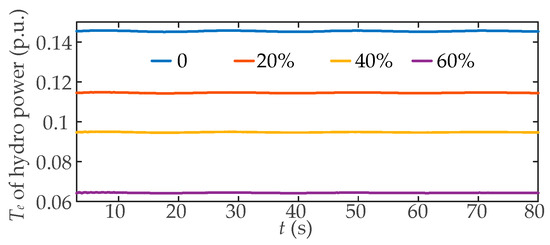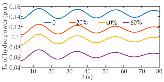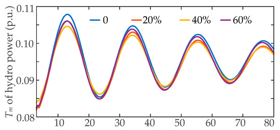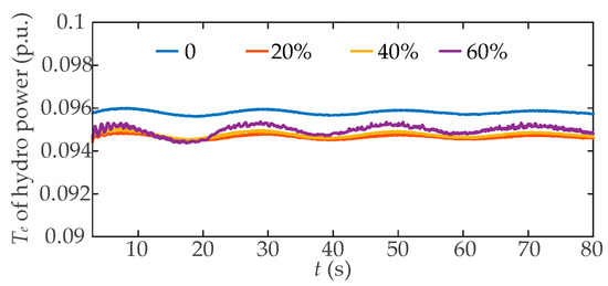 In Table 3, the results indicate that with more wind power integrated to replace hydropower of the sending system, the oscillation frequency of ULFO is almost unchanged (about 0.047 Hz), while it indeed enhances the damping of ultra-low frequency, which is beneficial for ULFO suppression. Moreover, in Figure 9 and Figure 10 due to the changing capacity of hydropower units, both electromagnetic and mechanical torque will change. But, the deviation of mechanical torque change is still greater than electromagnetic power, which is consistent with previous conclusions.
