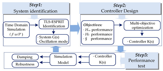Based on the analysis above, the negative damping effect of the sending system is the key cause of ULFO. The main idea of the DFIG’s control is to make wind power provide positive damping so damping controllers can be designed in wind generators. Moreover, to enhance the robustness of the controller, H2/H∞ robust control is applied. There are three steps for the damping controller: system identification, damping controller design, and performance test. Thus, the basic control theory used for the damping controller design is discussed in this part. A flowchart of the controller configuration is given in Figure 12.